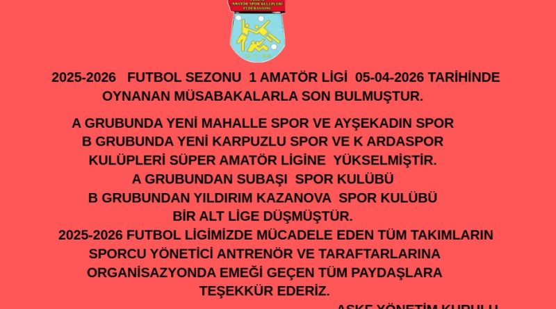 2025-2026 FUTBOL SEZONU 1 AMATÖR LİGİ 05-04-2026 TARİHİNDE OYNANAN MÜSABAKALARLA SON BULMUŞTUR.