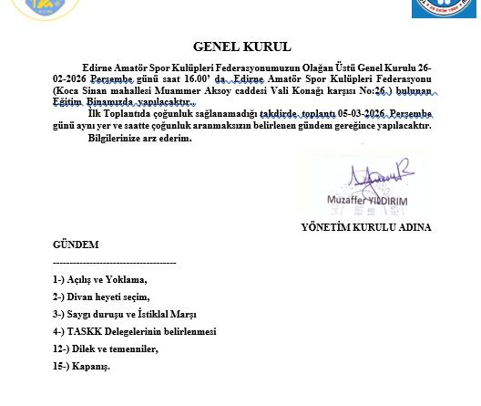 Edirne Amatör Spor Kulüpleri Federasyonumuzun Olağan Üstü Genel Kurulu 26-02-2026 Perşembe günü saat 16.00’ da Edirne Amatör Spor Kulüpleri Federasyonu (Koca Sinan mahallesi Muammer Aksoy caddesi Vali Konağı karşısı No:26 ) bulunan Eğitim Binamızda yapılacaktır..